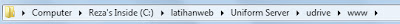 Ini adalah sebuah hal yang simple tapi memiliki peranan yang amat besar. Karena, jika data web lokal anda disimpan di folder yang salah, maka secara otomatis, web lokal tersebut tidak akan muncul ketika ditayangkan pada browser. Sayang kan.. Kalo hasil web yang anda buat tidak bisa ditayangkan hanya karena masalah ini??? Nah, untuk mengetahuinya lakukan double click folder latihanweb -> Uniform Server -> udrive -> www.